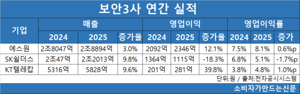 KT텔레캅(대표 장지호)은 매출이 10% 가까이 늘고 영업이익은 40%나 증가했다. 에스원(대표 정해린)도 영업이익이 두 자릿수 비율로 증가했다. 반면 SK쉴더스(대표 민기식)는 영업이익이 20%가량 감소했다.