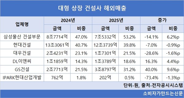 삼성물산, 매출 절반 이상 해외서 벌어…현대건설 12.3조 원 최대, GS건설 증가율 1위