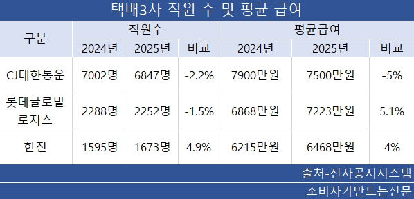 CJ대한통운은 직원 평균 연봉이 5% 감소했고, 롯데글로벌로지스와 한진은 5% 안팎 늘었다.