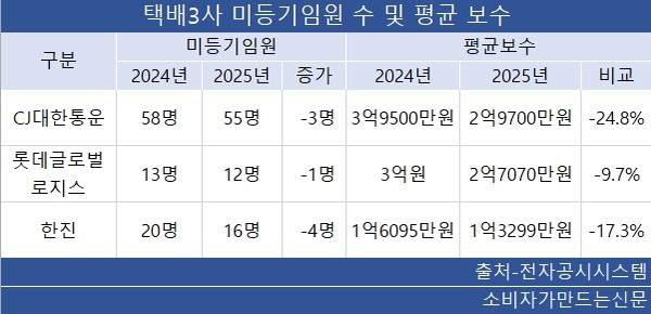 한진(대표 노삼석)은 직원 수가 5% 증가한 반면 미등기 임원은 20명에서 16명으로 줄었다. 택배 3사의 미등기 임원 평균 보수는 모두 낮아졌다.