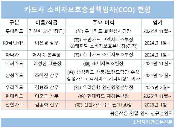 금융당국이 '소비자보호거버넌스' 강화를 위해 금융회사 소비자보호총괄책임자(CCO)의 임기를 2년 이상 보장하도록 권고한 가운데 주요 카드사 CCO들이 연임하는 사례가 잇따르고  있다.