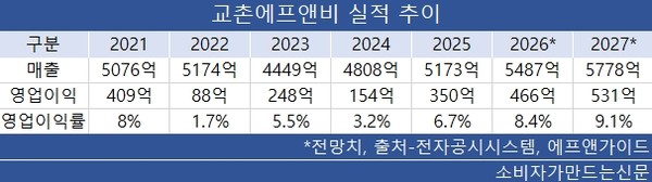 에프앤가이드 컨센서스에 따르면 교촌에프앤비의 올해 매출 전망치는 5487억 원으로 전년 대비 6% 증가할 것으로 보인다. 영업이익은 466억 원으로 33% 증가할 전망이다. 전망치가 실현되면 2021년에 이어 5년 만에 8%대 영업이익률을 기록하게 된다.