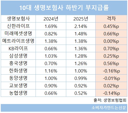 생명보험협회 공시에 따르면 2025년 하반기 기준 10대 생보사 중 보험금 부지급률이 가장 높은 곳은 신한라이프였다. 신한라이프는 전년 동기 대비 0.45%포인트 상승한 2.14%를 기록했다. 10대 생보사 중에서 유일하게 부지급률 2% 이상이었다.