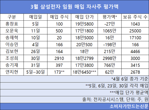 3월 주식 매입에 나선 임원들 중 오문욱 부사장과 송재혁 DS부문 CTO(사장)은 각각 2만5000주, 1만7100주의 주식을 보유하고 있다.
