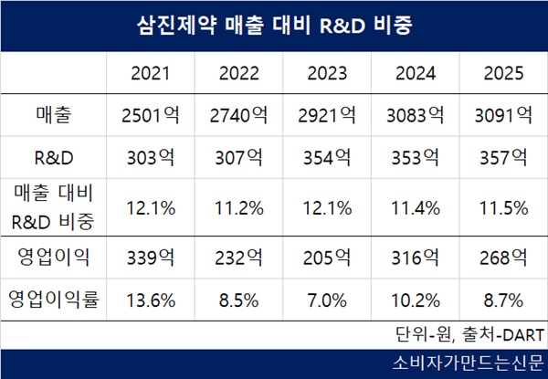 이는 삼진제약이 올해 핵심 경영 기조로 삼고 있는 성장 축 다각화와 수익성 중심 사업구조 재편과 궤를 같이 한다. 삼진제약은 5년 전 13.6%에 달했던 영업이익률이 대체로 하락세를 보이고 있다.