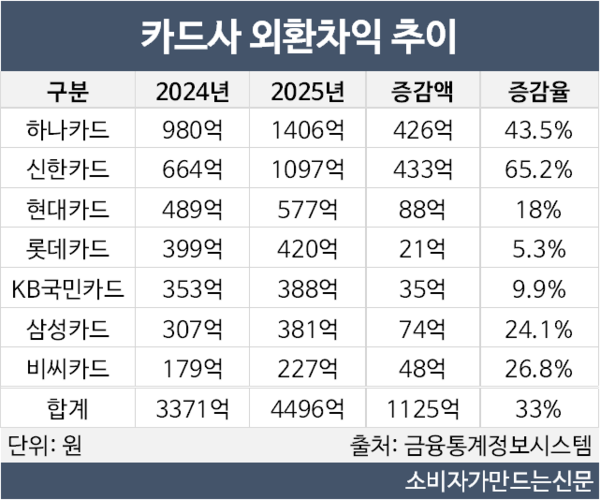 카드사 관계자는 "지난해엔 해외 취급액과 고환율이 복합적으로 반영된 것 같다"며 "외환차익은 해외 취급액이 늘어난 만큼 증가하는 효과가 있고 더불어 지난해 고환율도 일부 영향을 미쳤다"고 설명했다.