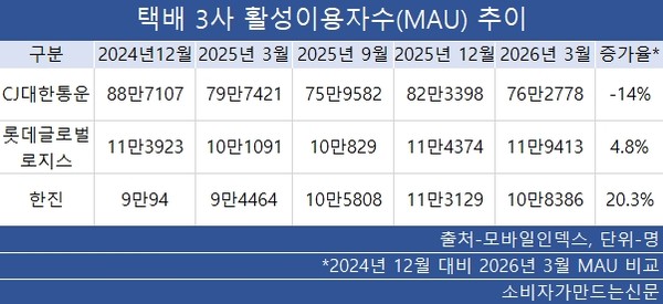 다만 연말에는 택배 물동량이 집중되는 계절적 영향이 반영된 측면이 있다. 지난 3월 말 기준 CJ대한통운의 MAU는 전년 동기 대비 4.3% 줄어들었다.