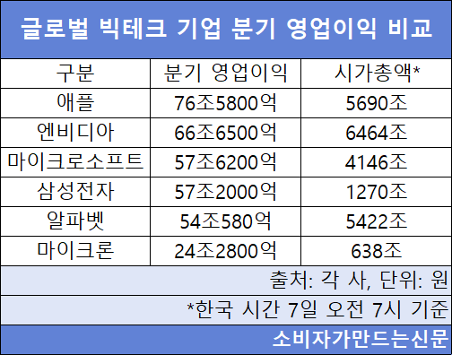 엔비디아는 삼성전자보다 영업이익은 1.2배 많지만, 시총은 5.1배 크다. 애플 역시 삼성전자보다 영업이익은 1.4배 많은데, 시총은 4.5배 크다.