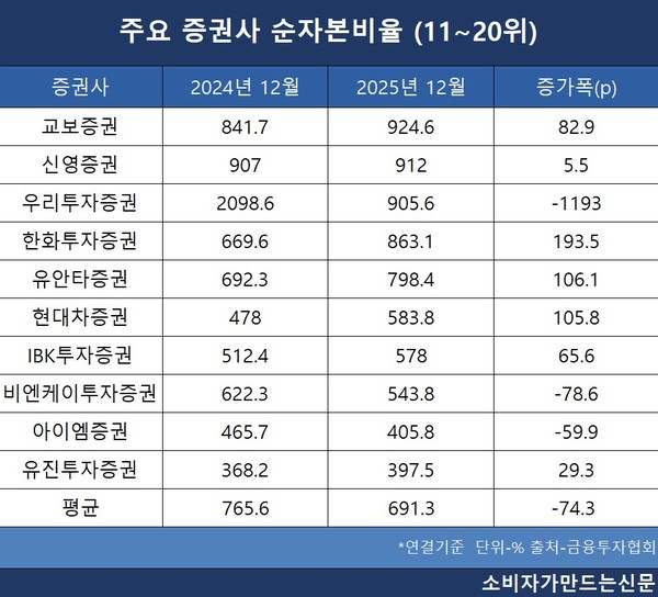 증가폭은 한화투자증권(대표 장병호)이 2024년 말 669.6%에서 2025년 말 863.1%로 193.5%포인트 상승하면서 가장 높았다. 유안타증권(대표 뤄즈펑)과 현대차증권(대표 배형근)도 각각 106.1%포인트, 105.8%포인트 개선되면서 증가폭이 상대적으로 컸다.