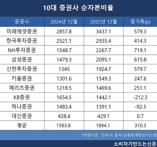 반면 KB증권(대표 강진두·이홍구)과 하나증권(대표 강성묵) 등 2곳은 10대 증권사 중에서 순자본비율이 하락한 곳이다. KB증권은 2024년 말 1654.5%에서 2025년 말 1442.1%로 212.3%포인트 하락했고 하나증권도 같은 기간 1483.4%에서 1391.1%로 92.3% 포인트 떨어졌다.