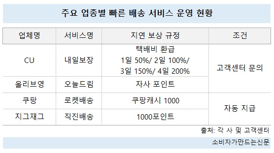소비자가만드는신문이 빠른 배송을 운영하는 업종별 대표 기업을 조사한 결과 쿠팡과 지그재그는 배송 지연 시 자사몰에서 사용 가능한 1000포인트를 자동 지급하는 것으로 확인됐다. 올리브영과 CU는 직접 고객센터에 문의해야 한다.