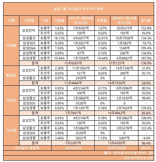 13일 전자공시시스템에 따르면 삼성그룹 오너 일가의 상장사 보유 주식가치는 79조7264억 원(10일 종가 기준)으로 집계됐다. 선대회장 별세 후 2021년 4월 상속세 납부를 시작하기 전과 비교하면 40조957억 원에서 89.4% 증가했다.
