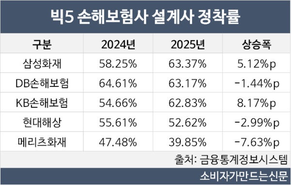 지난해 손해보험사 5곳 중 삼성화재, KB손해보험 2곳은 전년 대비 정착률이 상승했고 DB손해보험, 현대해상, 메리츠화재 3곳은 정착률이 하락했다.