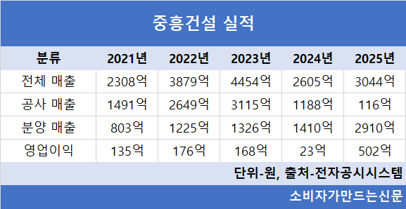 13일 전자공시시스템에 따르면 중흥건설의 지난해 매출은 3044억 원으로 전년 대비 16.8% 증가했다. 영업이익은 502억 원으로 전년 23억 원보다 20배 이상 늘었다.