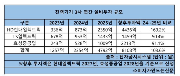 14일 전자공시시스템에 따르면 전력기기 3사의 지난해 설비투자 총액은 4792억 원으로 전년 대비 103.6% 증가했다.