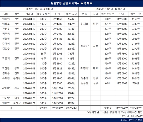 14일 전자공시시스템에 따르면 올해 들어 지난 13일까지 자기회사 주식 매수에 참여한 유한양행 임원은 14명이다. 이들은 5억2249만 원 규모의 5390주를 매입했다.