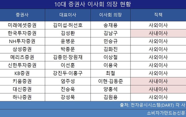 16일 업계에 따르면 3월 말 자기자본 기준 10대 증권사 중 이사회 의장을 사외이사가 맡고 있는 증권사는 미래에셋증권, NH투자증권, 삼성증권, 메리츠증권, 신한투자증권, KB증권, 하나증권 등 7곳이다.