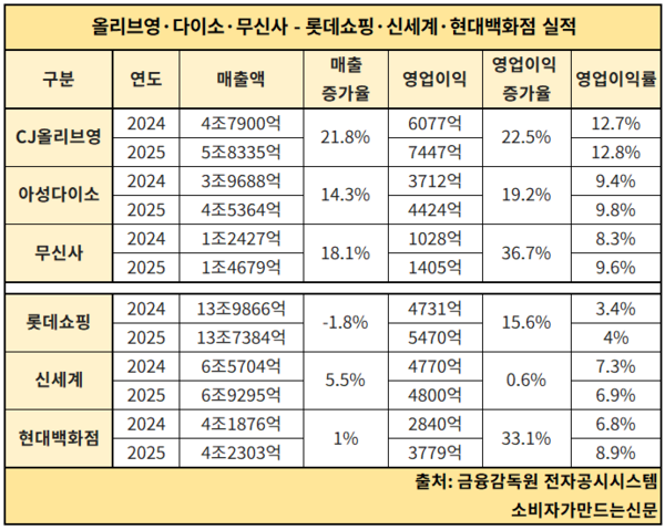 롯데쇼핑, 신세계, 현대백화점 전통 유통 3사가 한 자릿수 성장에 머무르거나 역성장을 기록한 반면 CJ올리브영(이하 올리브영), 아성다이소, 무신사는 지난해 나란히 고성장을 이어가며 시장 주도권을 확대했다. 대형 유통사들이 독점해온 국내 유통업계 성장 축이 취향과 실속을 앞세운 신흥 세력으로 빠르게 이동하고 있다는 전문가들의 분석이다.