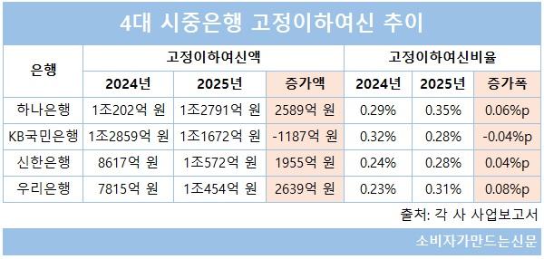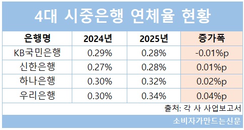 반면 우리은행(행장 정진완)은 4대 시중은행 중 건전성 지표가 가장 큰 폭으로 악화됐다. 고정이하여신잔액은 2024년 말 7815억 원에서 2025년 말 1조454억 원으로 2639억 원 늘어 가장 큰 폭으로 증가했다. 고정이하여신비율도 같은 기간 0.23%에서 0.31%로 0.08%포인트 상승했다. 연체율 역시 0.3%에서 0.34%로 0.04%포인트 올라 상승폭이 가장 컸다.