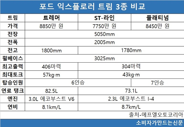 각 트림별 특징을 살펴본 결과 △트레머 트림은 '주행성능' △플래티넘은 '다인승 최적화' △ST-라인은 '가격'에서 유리했다.