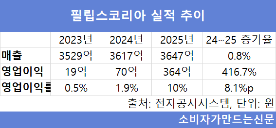 세금 환급에 따라 필립스코리아 영업이익률은 두 자릿수 비율로 확대됐다.
