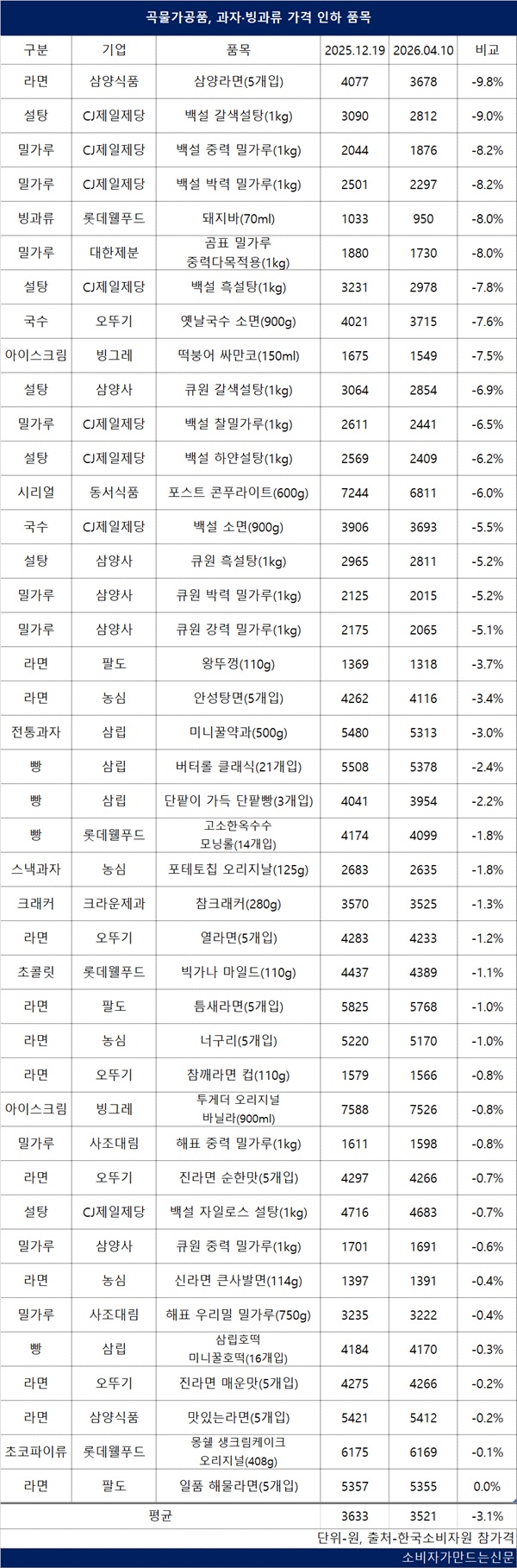 20일 소비자가만드는신문이 한국소비자원 참가격에서 제공하는 △곡물가공품 △과자·빙과류 등 총 67종의 판매가격을 지난해 연말과 비교한 결과 평균 0.6%(21원) 내려 제자리걸음 수준이었다.
