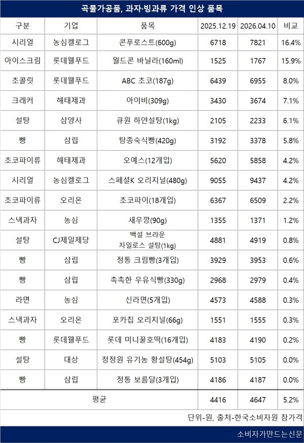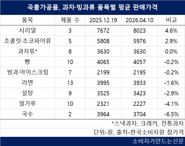 비교 대상 제품은 △라면(13종) △빵(10종) △시리얼(3종) △스낵과자/전통과자/크래커(8종) △빙과류/아이스크림(7종) △초코파이류/초콜릿(5종) △밀가루(10종) △국수(2종) △설탕(9종)이다.