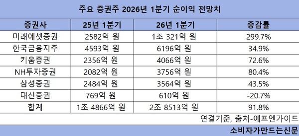금융정보업체 에프엔가이드에 따르면 주요 상장 증권사 6곳의 올해 1분기 순이익 합계 전망치는 2조 8513억 원으로 전년 동기 1조 4866억 원 대비 91.8% 증가할 것으로 예측됐다.