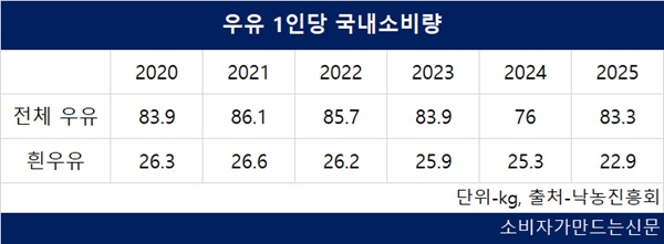 1인당 우유 국내소비량도 2021년 86.1kg에서 2024년 76kg까지 계속 줄어들다 지난해 83.3kg으로 소폭 반등했다. 흰우유 소비는 줄었어도 유제품 소비는 늘었다는 뜻이다.