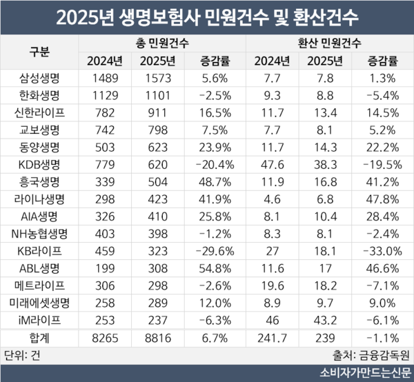 단순 민원건수로는 ABL생명과 삼성화재가 가장 크게 늘었고 고객 수를 반영한 '환산 민원건수' 기준에서는 ABL생명과 라이나생명이 40% 이상 급증하며 증가폭이 컸다.