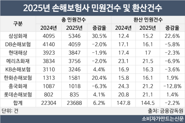 삼성화재 관계자는 "지난해 보험금 관련 민원이 많았으나 절대적인 보유 계약이 많은 영향도 있으며 환산건수는 가장 낮다"며 "지난해 말부터 고객 안내프로세스를 점검하고 고객 문의에 대한 신속한 피드백을 할 수 있도록 안내 프로세스를 정비하고 AI를 활용한 보험금 지급 정합성도 높이고 있다"고 강조했다.