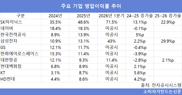 지난해 말 기준 영업이익률 순위는 SK하이닉스에 이어 ▲네이버(대표 최수연) 18.3% ▲한국전력공사(대표 김동철) 13.9% ▲삼성전자(대표 전영현·노태문) 13.1% ▲GS(대표 허태수·홍순기) 11.7% ▲한화에어로스페이스(대표 김동관·손재일) 11.4% 등의 순이었다.