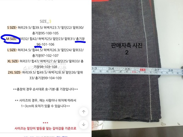 소비자들은 허리둘레, 총기장 등 상세 치수를 기준으로 구매 결정을 내리지만 실제 제품이 이를 크게 벗어나도 업체 측이 ‘정상 제품’이라고 주장하는 경우가 다반사다.