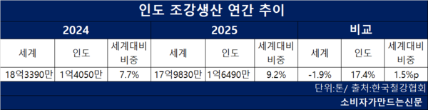 같은 기간 세계 생산이 17억9830만톤으로 1.9% 감소한 가운데 인도 비중은 7.66%에서 9.17%로 1.5%포인트 확대됐다. 인도 정부는 2036년 4억톤 생산능력 목표를 제시하며 산업 육성 기조를 이어가고 있다.