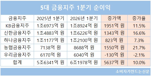 올해 1분기 5대 금융지주의 당기순이익은 6조1978억 원으로 전년 동기 5조6341억 원 대비 10% 증가했다.