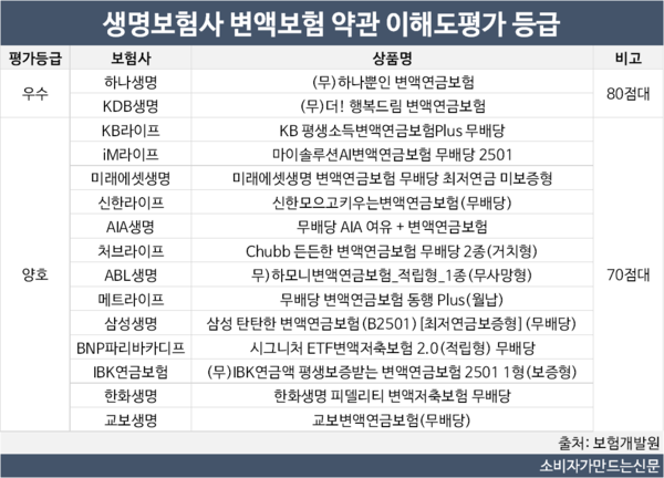 하나생명의 '(무)하나뿐인 변액연금보험'의 평가점수는 80점대로 '우수' 등급을 받았으며 평가점수도 생명보험사 중 가장 높았다.