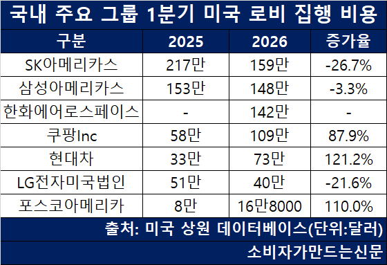 SK, 1분기 對美 로비액 159만 달러 '톱'...한화에어로·쿠팡·현대차·포스코도 급증