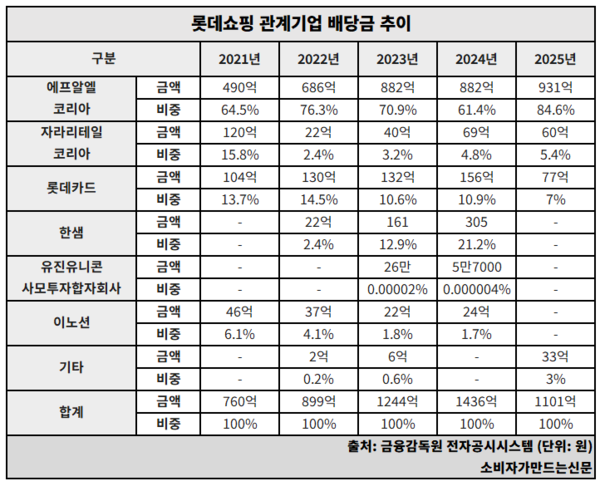 롯데쇼핑이 에프알엘코리아로부터 받은 배당금은 ▲2021년 490억 원 ▲2022년 686억 원 ▲2023년 882억 원 ▲2024년 882억 원 ▲2025년 931억 원으로 꾸준히 증가했다. 5년 새 약 90% 확대된 셈이다.