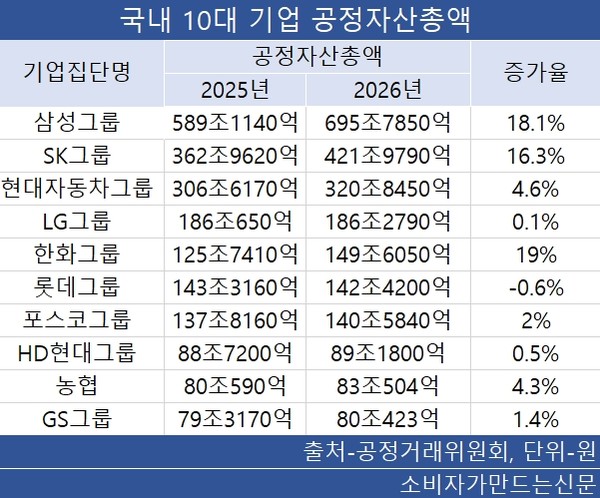 이어 SK그룹 421조9790억 원, 현대자동차그룹 320조8450억 원, LG그룹 186조2790억 원 순이다.