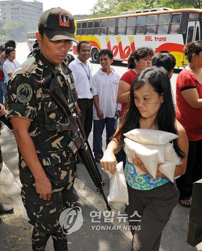 쌀값폭등에 주민불안이 가중되고있는 가운데 아로요필리핀대통령은 쌀값앙등대책 비상회의를 소집했는 데 사진은 4일 마닐라 정부미방출분배소에서 군인이 배치돼있는 가운데 쌀을 구매하고있는 필리핀 주민들.<사진=연합뉴스>